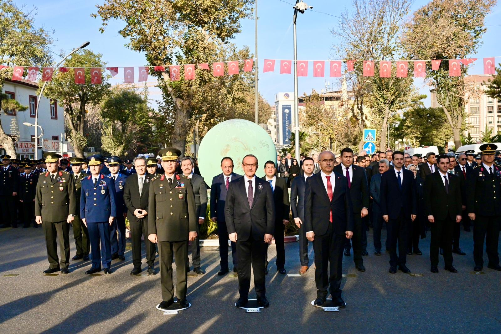Gazi Mustafa Kemal Atatürk’ün ebediyete irtihalinin 87. Yıl Dönümü nedeniyle Cumhuriyet Meydanı Atatürk Anıtı önünde düzenlenen törende Atatürk Anıtına çelenk sunuldu. Saat 09.05’te çalınan sirenlerle Atatürk’ün, manevi huzurunda saygı duruşunda bulunulmasının ardından okunan İstiklal Marşı ile şanlı bayrağımız yarıya indirildi.