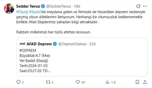 AFAD, merkez üssü Elazığ’ın Baskil ilçesi olan 4,7 büyüklüğünde bir deprem meydana geldiğini duyurdu. Sarsıntı Malatya başta olmak üzere bölgedeki pek çok ilde hissedilirken, Malatya Valisi Seddar Yavuz herhangi bir olumsuzluğun yaşanmadığını açıkladı.