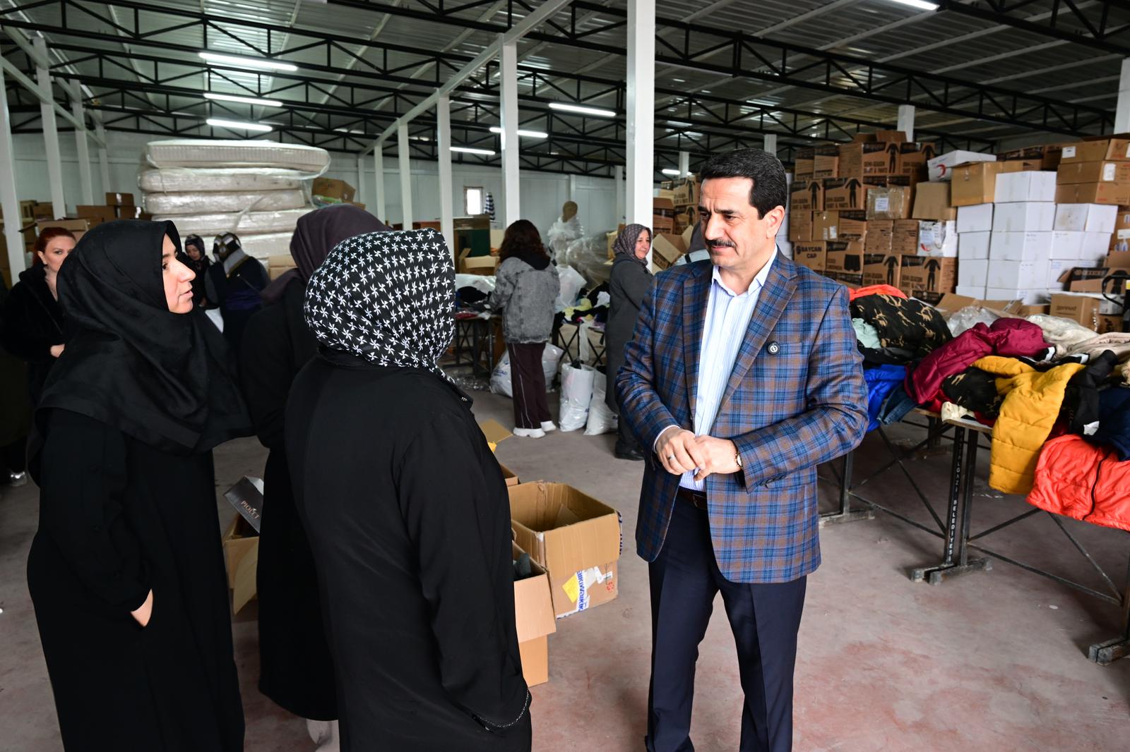Battalgazi Belediye Başkanı Bayram Taşkın, Sosyal Hizmetler Müdürlüğü Lojistik Deposu’nda Ak Parti Battalgazi İlçe Kadın Kolları Mahalle Başkanlarıyla birlikte gerçekleştirilen yardım malzemesi tasnif çalışmalarına eşlik etti.