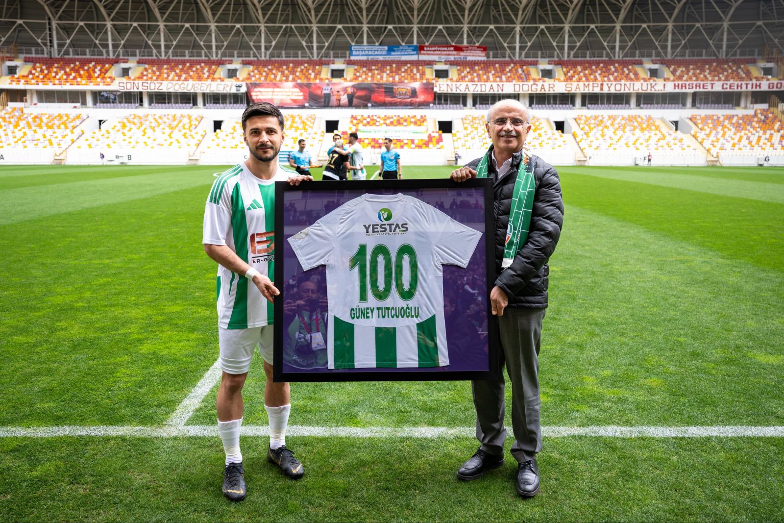 Müsabaka öncesinde Malatya Büyükşehir Belediye Başkanı Sami Er, Yeşilyurtspor’un gol yollarındaki en önemli isimlerinden Güney Tutçuoğlu’na kariyerinde ulaştığı 100. gol dolayısıyla imzalı forma takdim etti. Bu anlamlı jest, taraftarlar tarafından da alkışlarla karşılandı.